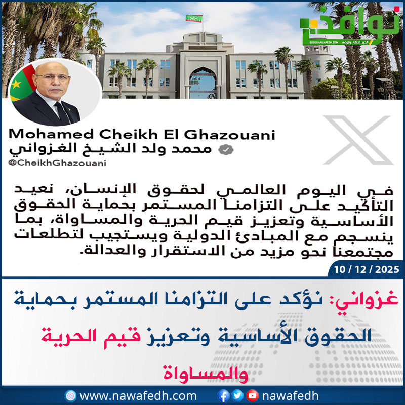 قال رئيس الجمهورية محمد ولد الشيخ الغزاني إنه يعيد التأكيد على التزامه المستمر بحماية الحقوق الأساسية، وتعزيز قيم الحرية والمساواة.