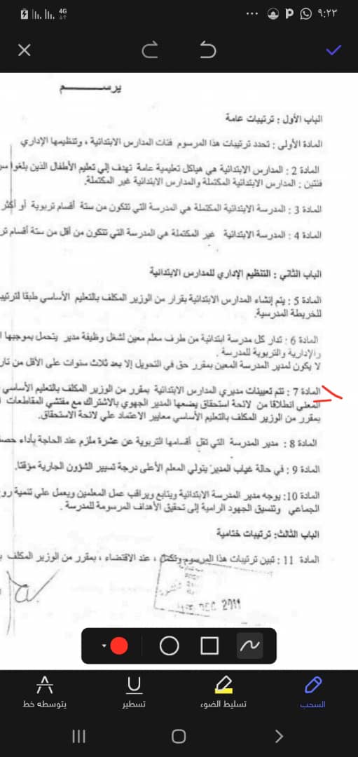 وأوضح المتظلم أن المرسوم ينص صراحة على أن تعيين مديري المدارس الابتدائية يجب أن يتم بمقرر من الوزير المكلف بالتعليم الأساسي، بناءً على اقتراح من الوالي، واستناداً إلى لائحة استحقاق يعدها المدير الجهوي بالتعاون مع مفتشي المقاطعات، وهي إجراءات لم تعد تُحترم، وفق قوله.