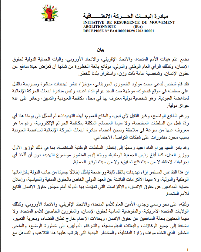 قالت حركة (إيرا) إن رئيسها بيرام الداه اعبيد تعرض لتهديد مباشر وصريح بالقتل من شخص يُدعى محمد مولود الخسوري في منشور عبر فيسبوك، مضيفة أنه تم إبلاغ السلطات لكنها لم تتخذ أي إجراء.