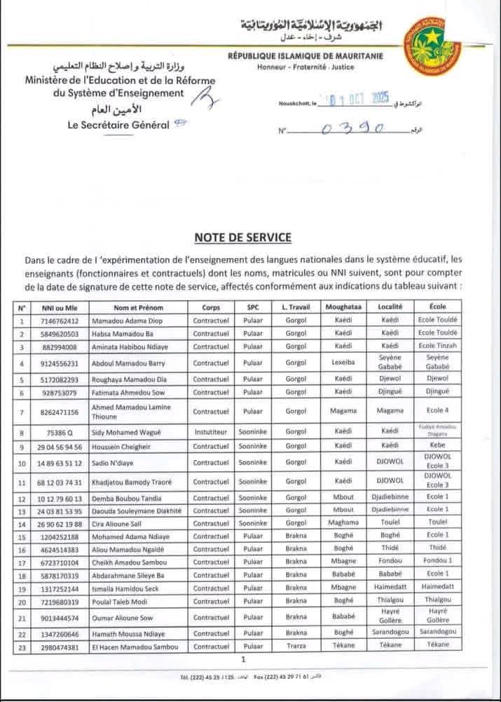 عبّر عدد من مدرّسي اللغات الوطنية (البولارية، السوننكية، والولفية) عن قلقهم إزاء وضعيتهم الإدارية والمهنية، بعد مرور ما يقارب ثلاثة أشهر على مباشرتهم التدريس ميدانيًا ضمن البرنامج الوطني، دون توقيع عقود عمل أو صرف رواتب.