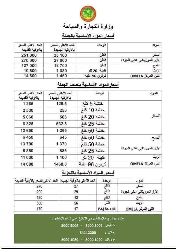 وشمل الإعلان تحديد سقوف أسعار السكر، والأرز الموريتاني عالي الجودة، والقمح، والزيت، واللبن المركز من نوع OMELA، مع نشر تفاصيل الأسعار بالأوقية القديمة والجديدة، وتوزيعها حسب مستويات البيع.