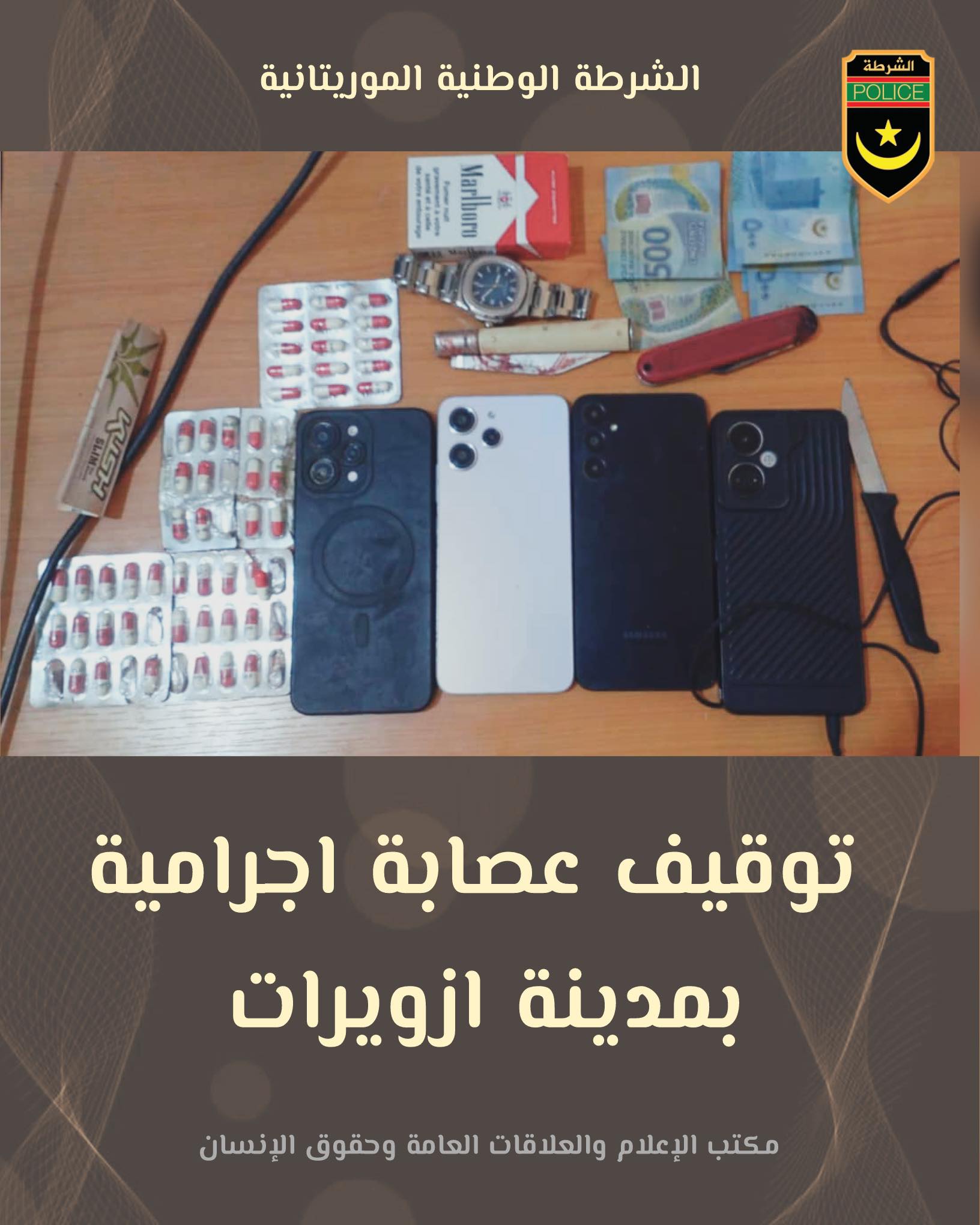 أعلنت الشرطة الوطنية أنه بناء على شكايات تقدم بها مواطنون تعرضوا للتهديد بالاعتداء بالسلاح الأبيض، وعلى إثر عمليات بحث مكثفة تمكنت مفوضية الشرطة بمدينة ازويرات يوم الخميس 15 يناير 2026 من توقيف عصابة اجرامية تتألف من أربعة من أصحاب السوابق، في المنزل الذي تتخذه العصابة وكرا لعملها الإجرامي حيث وجد افرادها في حالة تلبس بتعاطي مواد مخدرة، وقد ضبطت بحوزتهم كمية من حبوب لاريكا المهلوسة وكمية من حبوب لفترين وعلبة لفايف من لارزين.