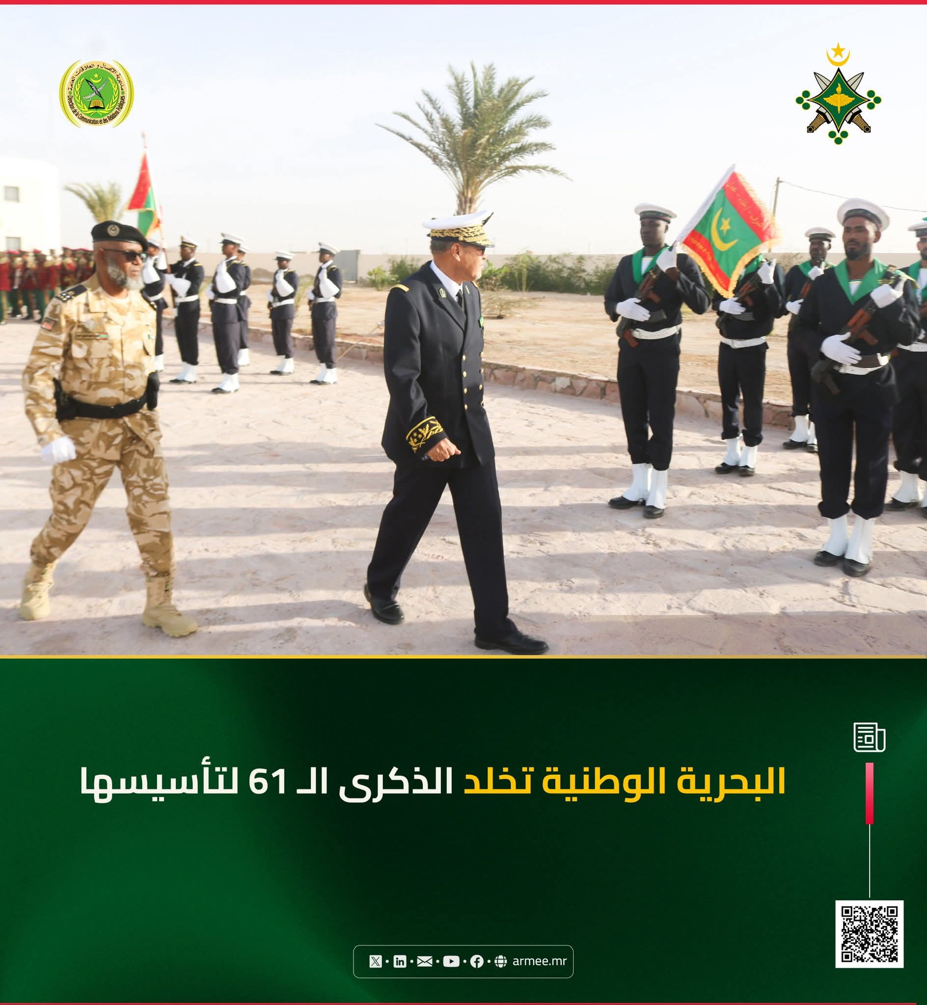خلدت أركان البحرية الوطنية، صباح اليوم الأحد 25 يناير 2026، الذكرى الحادية والستين لتأسيسها، حيث تضمنت الفعاليات حفلًا لرفع العلم الوطني، نُظم بمقر قيادة أركان البحرية الوطنية بنواكشوط.