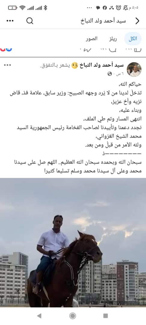 ولد التباخ أعلن “الصلح ” عبر صفحته على فيسبوك، مع شعور بالتفوق عبر عنه بالإشارة المحيلة إليه، مشيدًا بتدخل من قال إن “وجهه لا يُرد”، واصفًا الوسيط بأنه وزير سابق، وعلامة فذة، وقاضٍ نزيه، وأخ عزيز، قبل أن يعلن باقتضاب: