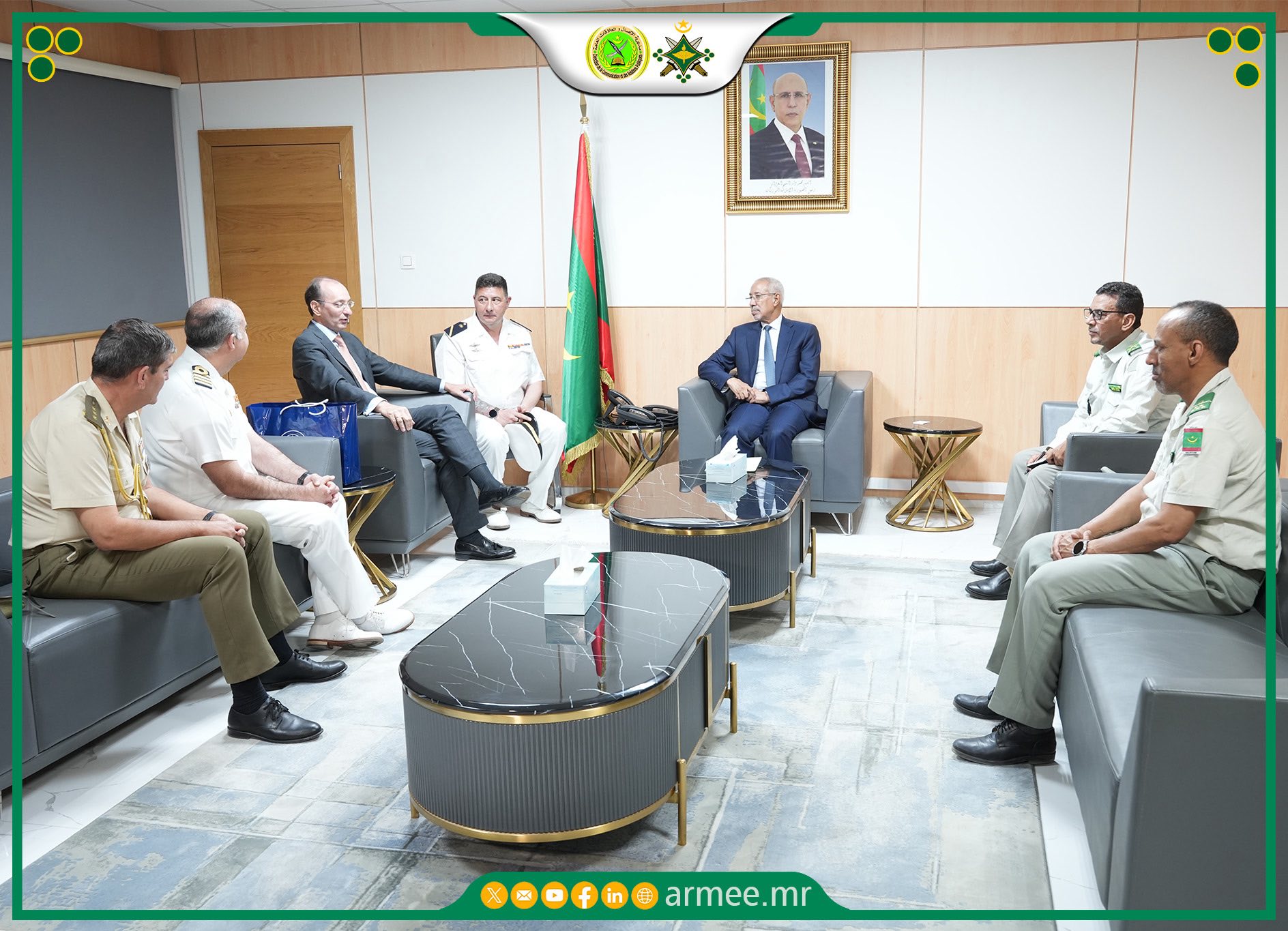 استقبل وزير الدفاع وشؤون المتقاعدين وأولاد الشهداء السيد حننه ولد سيدي، اليوم الخميس، بمكتبه في نواكشوط، سفير المملكة الإسبانية المعتمد لدى موريتانيا، سعادة السيد أبابلو بوبار كوميز رفقة قائد سفينة الهجوم البرمائي الاسبانية “جاليسيا” (GALICIA) العقيد البحري جان جوزى بليزون إيزي كويردو.