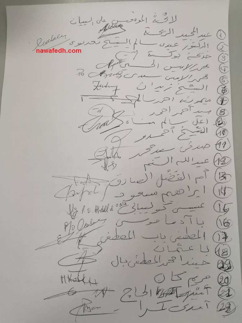 ولم يوقع البيان الوزير محمد ولد عبد الفتاح ولا رئيس اللجنة سيدنا علي ولا بيجل ولد هميد .