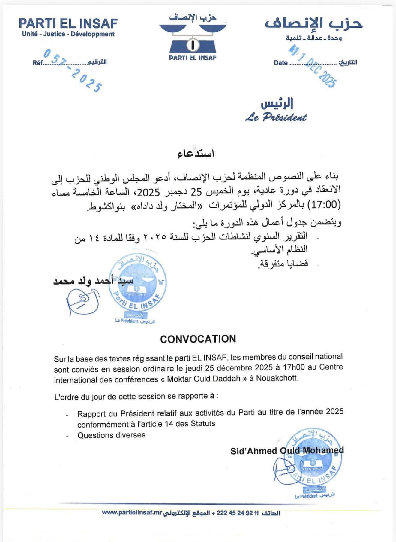 دعا المجلس الوطني لحزب الإنصاف الحاكم في موريتانيا مجلسه الوطني للانعقاد في دورة عادية، يوم الخميس الخامس والعشرين من دجمبر الجاري.