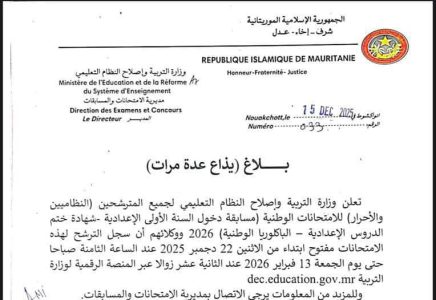 وأوضحت الوزارة أن سجل الترشح سيكون مفتوحًا ابتداءً من الاثنين 22 ديسمبر 2025 الساعة 08:00 صباحًا وحتى الجمعة 13 فبراير 2026 الساعة 12:00 ظهرًا، عبر المنصة الرقمية للوزارة: dec.education.gov.mr.