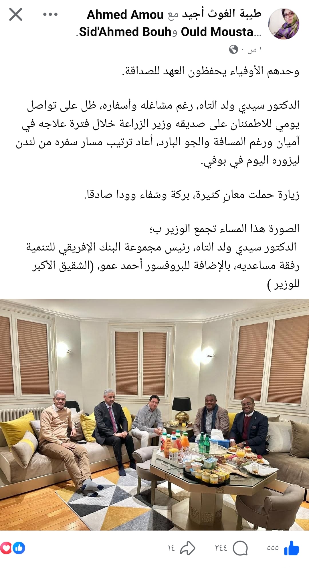 أشادت حرم وزير الزراعة والسيادة الغذائية سيدي أحمد ابوه السيدة طيبة بنت الغوث بوفاء رئيس مجموعة البنك الإفريقي للتنمية سيدي ولد التاه لصديقه الوزير.
